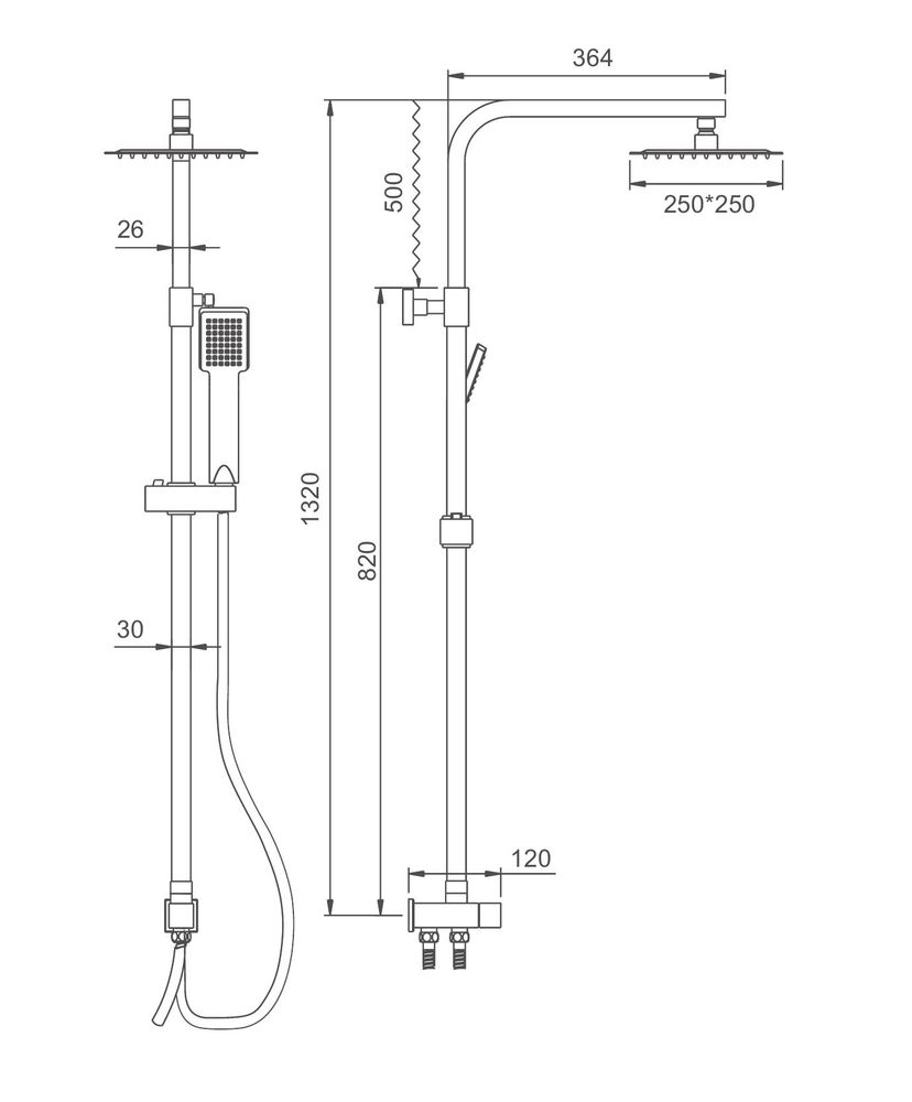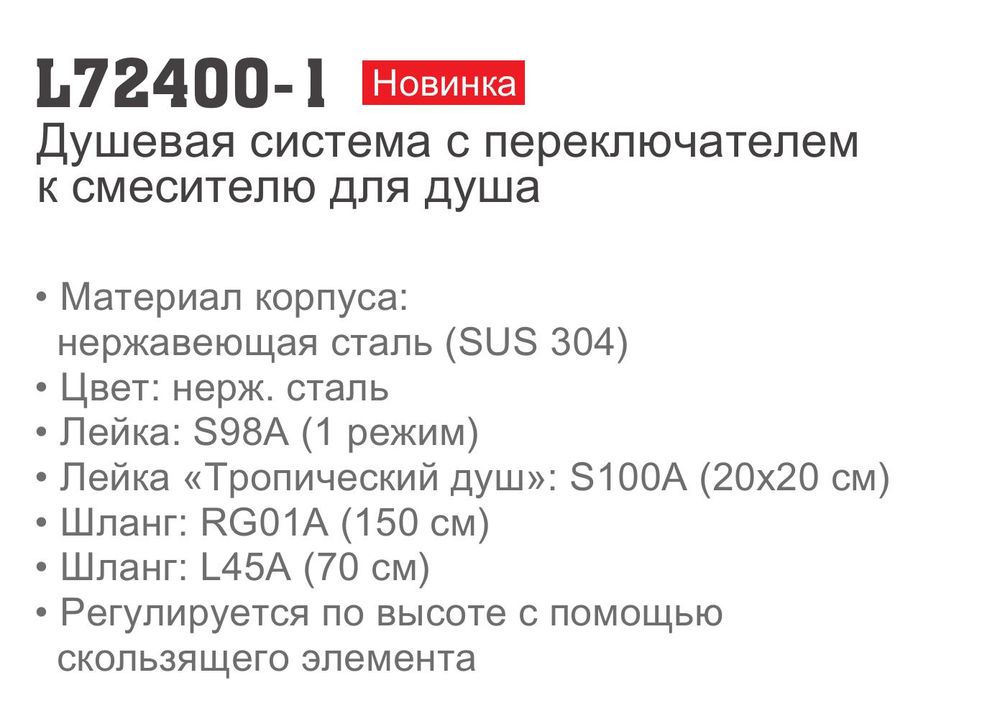 | Комплектация | Верхний душ, Держатель для лейки, Душевой шланг, Лейка для душа |