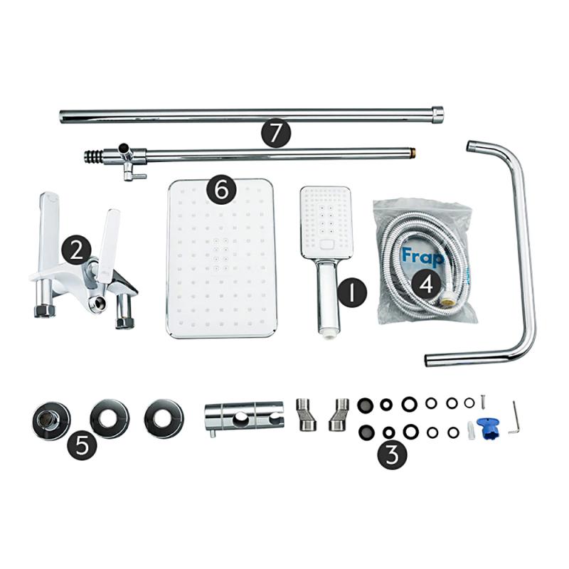 | Комплектация | Верхний душ, Держатель для лейки, Душевой шланг, Лейка для душа, Смеситель |
