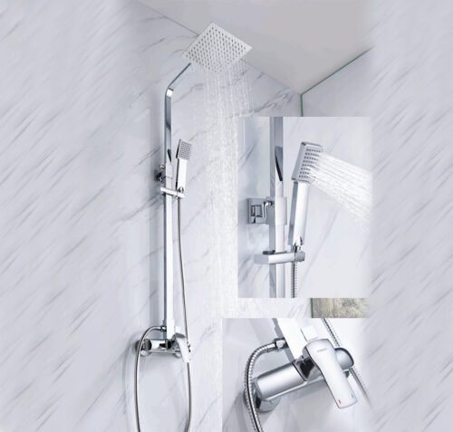 Смеситель; Стойка для душа; Тропическая лейка; Набор для монтажа; Лейка для душа; Шланг в металлической оплётке 1500 мм; Регулируемый держатель лейки.