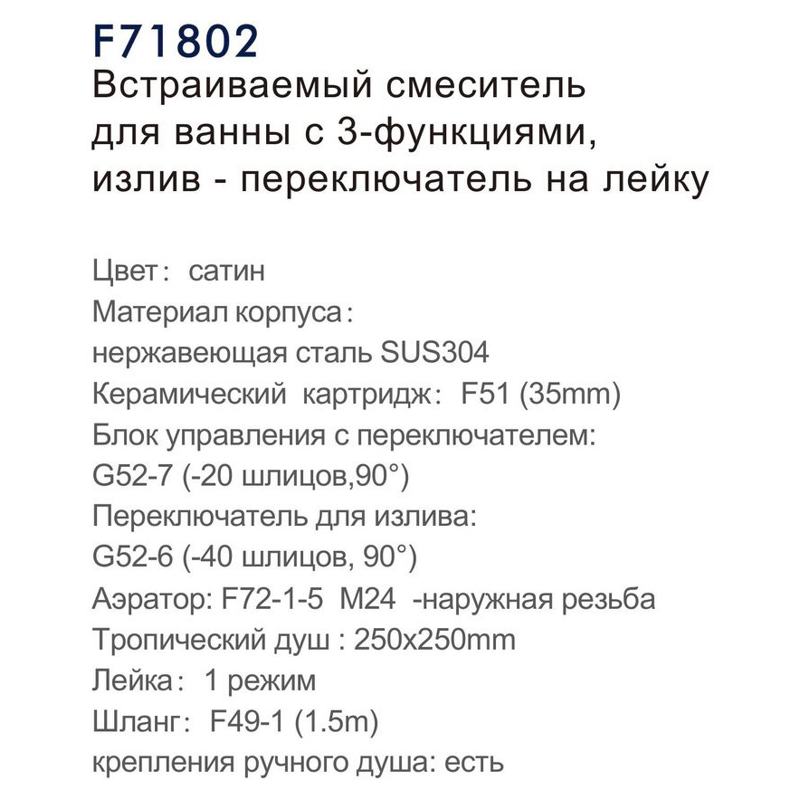 | Комплектация | Верхний душ, Держатель для лейки, Душевой шланг, Лейка для душа, Смеситель |