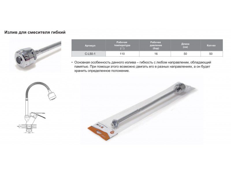 Гибкий излив для кухонного смесителя с лейкой TIM C-L50-1