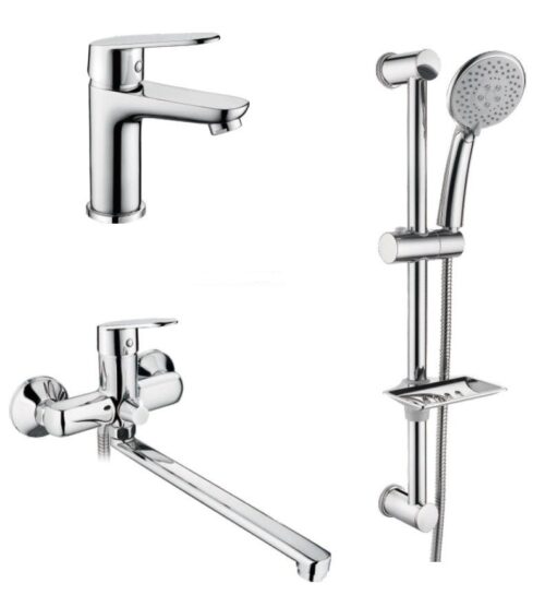 | Комплектация | Смеситель для ванны; Смеситель для умывальника; Стойка для душа; Набор для монтажа; Лейка для душа; Шланг в металлической оплётке 1500 мм; Регулируемый держатель лейки; Мыльница |