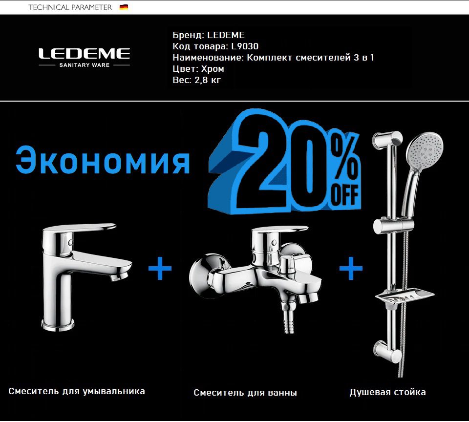 Доверьтесь немецкому качеству и функциональности – выберите комплект смесителей для ванной комнаты 3 в 1 L9030 от Ledeme!