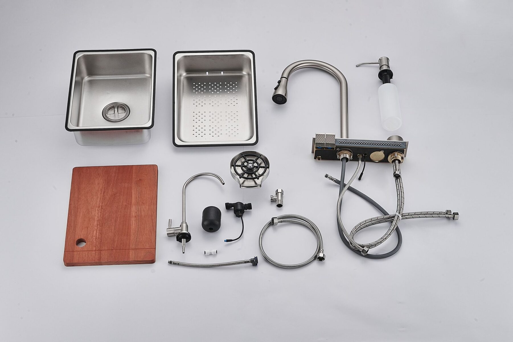 Комплект для установки, Мойка из нержавеющей стали, Панель со смесителем, кран для питьевой воды, дозатор для м/средства и ополаскиватель стаканов, Разделочная доска из дерева, Чаша из нержавеющей стали с отверстием для слива и пластиковой крышкой, Чаша с множеством отверстий из нержавеющей стали
