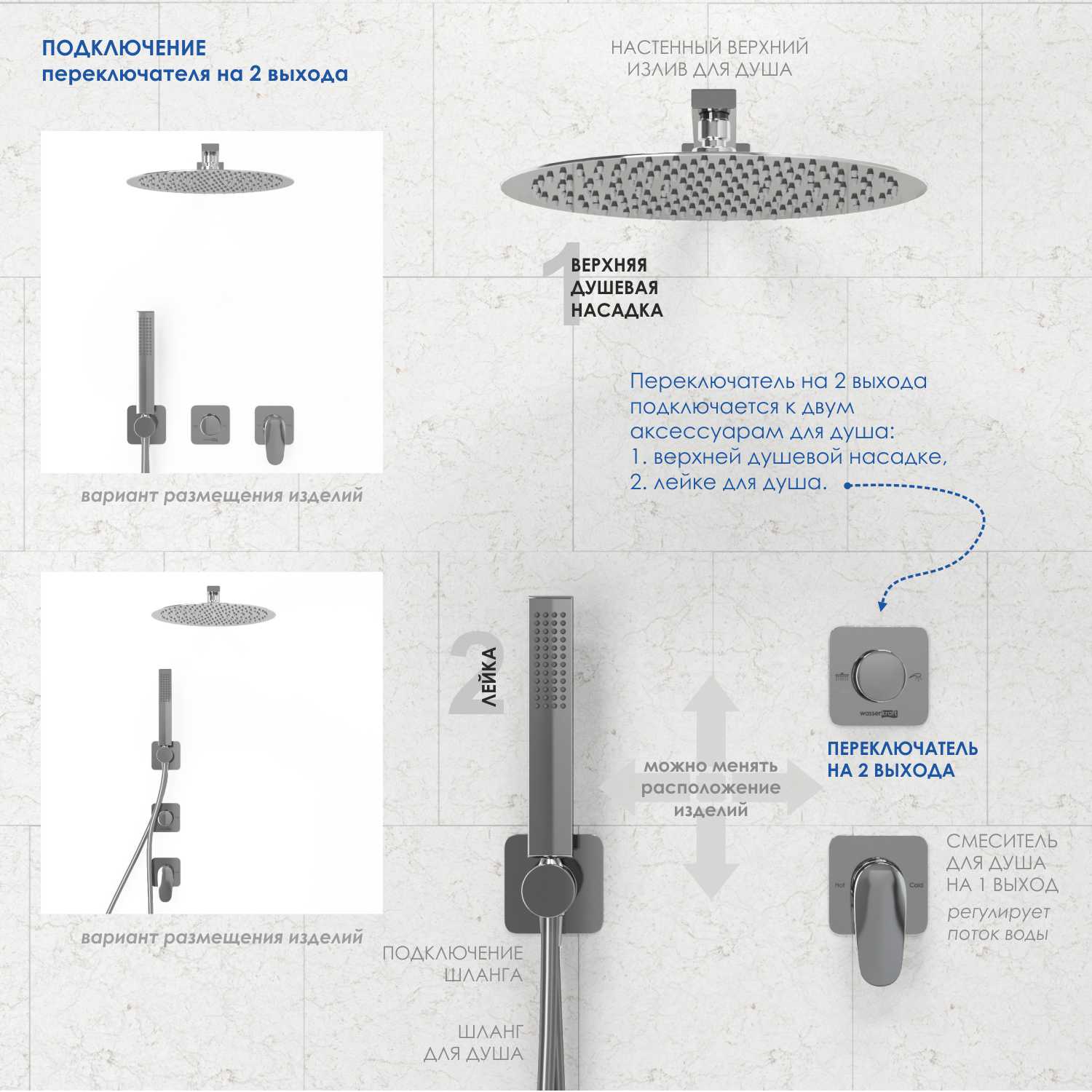 – Переключатель на 2 выхода. Подключается к двум аксессуарам для душа на выбор: верхней душевой насадке, лейке для душа и настенному изливу. В зависимости от ваших предпочтений.
