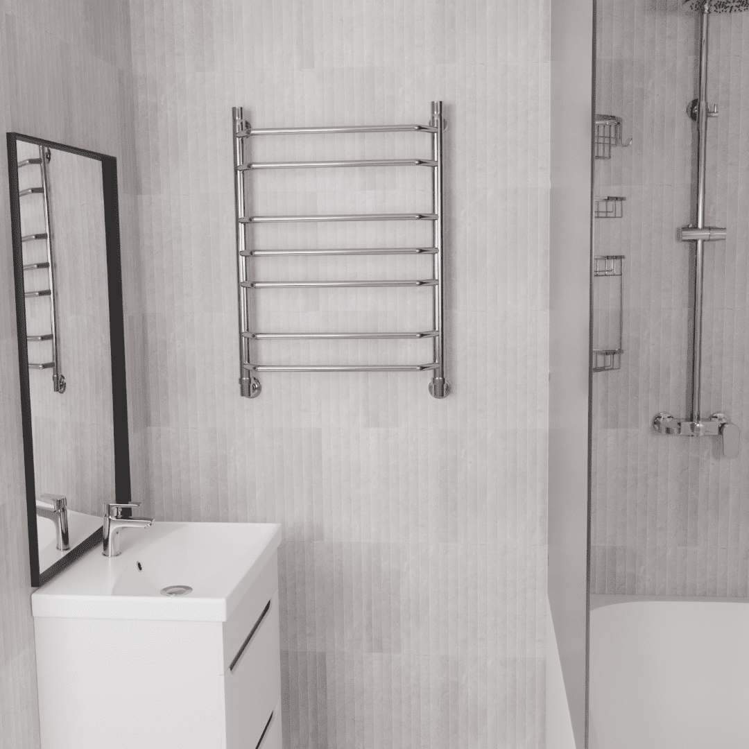 Основной материал для изготовления полотенцесушителя — нержавеющая сталь марки AISI304 с 2-миллиметровой толщиной стенок. Она не подвержена воздействию тяжелой воды, появлению коррозии и влиянию резких перепадов давления в системе. Также за счет электро-плазменной полировки изделие долгое время сохраняет внешний вид без царапин и помутнений.