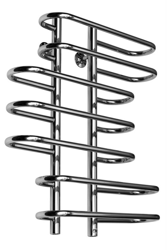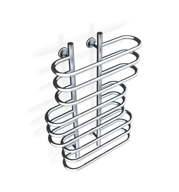 Объемная модель полотенцесушителя, которая по форме представляет собой лесенку с тремя группами перекладин в виде полуовалов, которые смещены в разные стороны.
