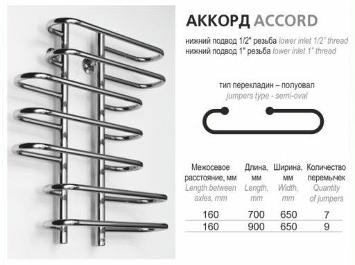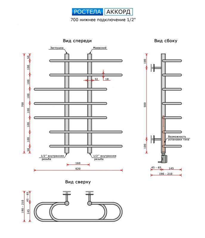 Полотенцесушитель Ростела Аккорд (нижн.подв., 1/2" резьба) 160 x 700 x 650 / 7