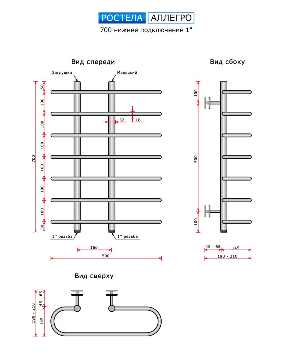 Полотенцесушитель Ростела Аллегро (нижн.подв.,1" резьба) 160 x 700 x 500 / 7