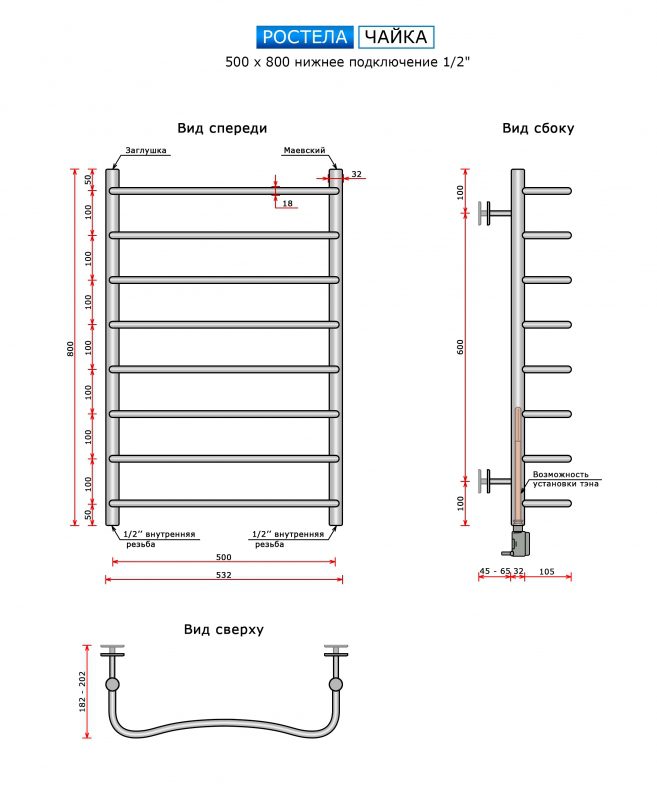 Полотенцесушитель Ростела Чайка (нижн.подв., 1/2" резьба) 500 х 800 / 8