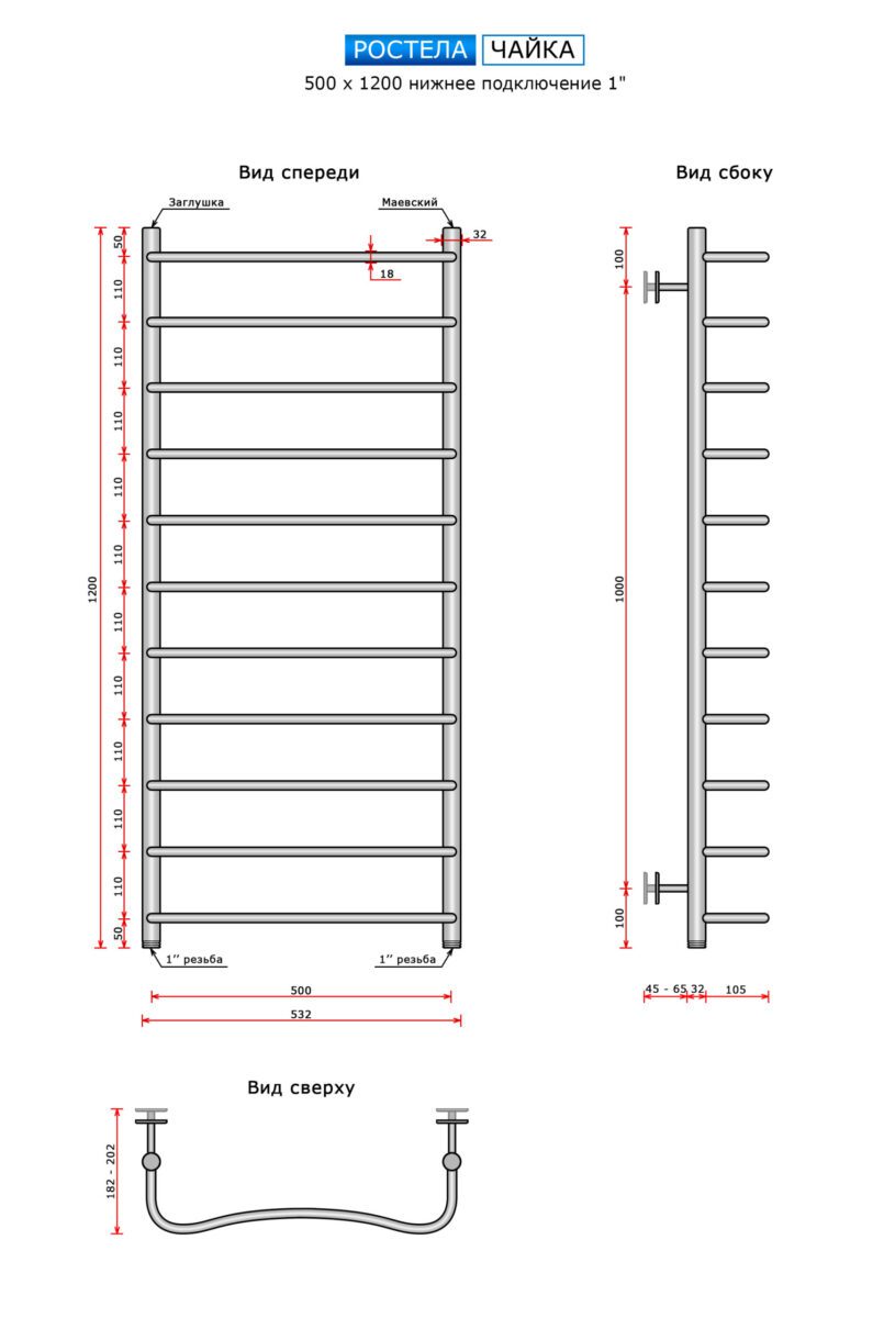 Полотенцесушитель Ростела Чайка (нижн.подв., 1" резьба) 500 х 1200 / 11