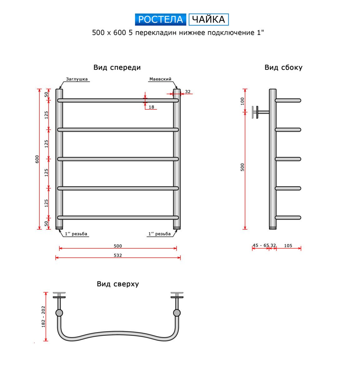 Полотенцесушитель Ростела Чайка (нижн.подв., 1" резьба) 500 х 600 / 5