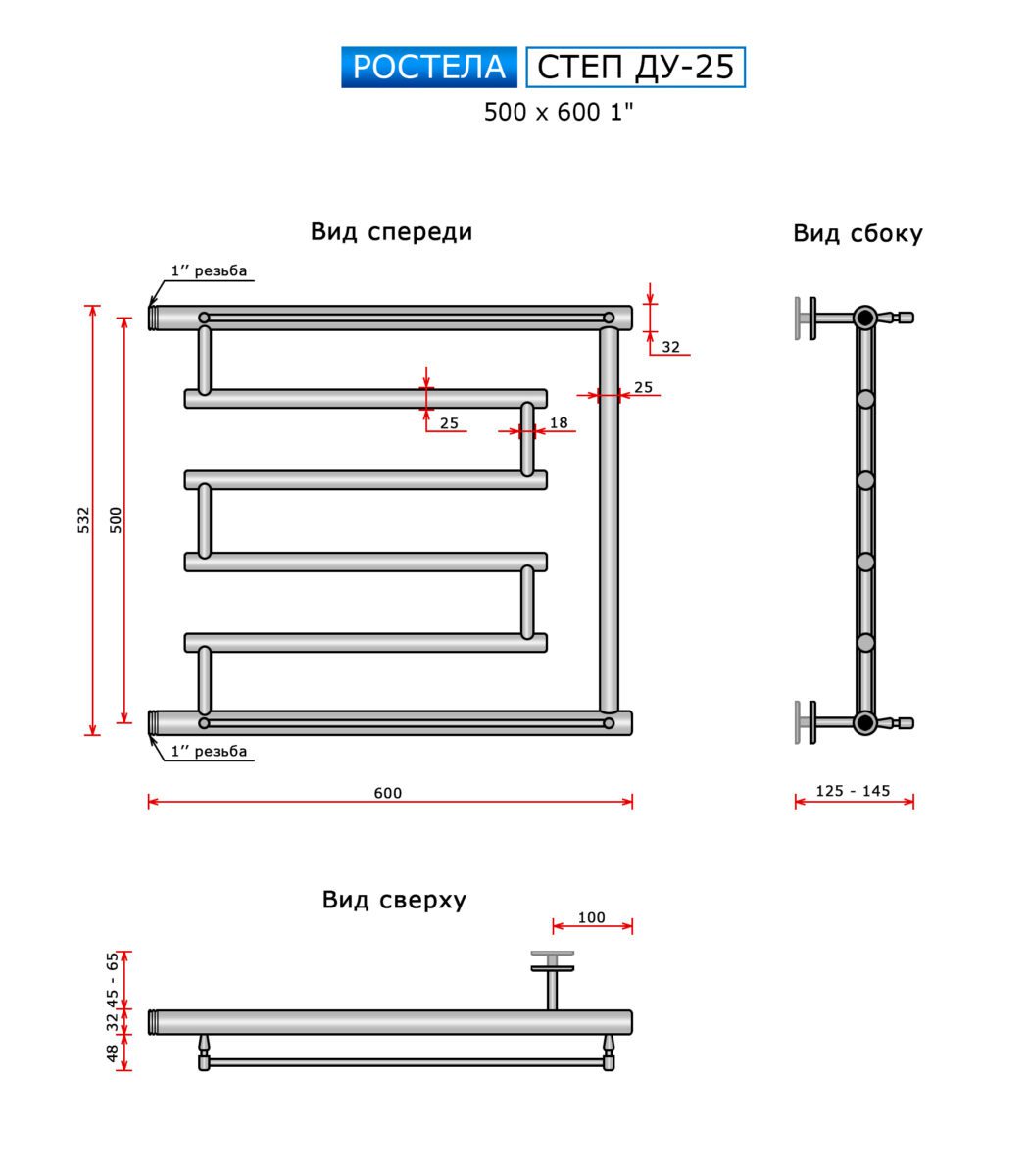 Полотенцесушитель Ростела Ду-25 (бок.подв., 1" резьба) Степ 500 x 600