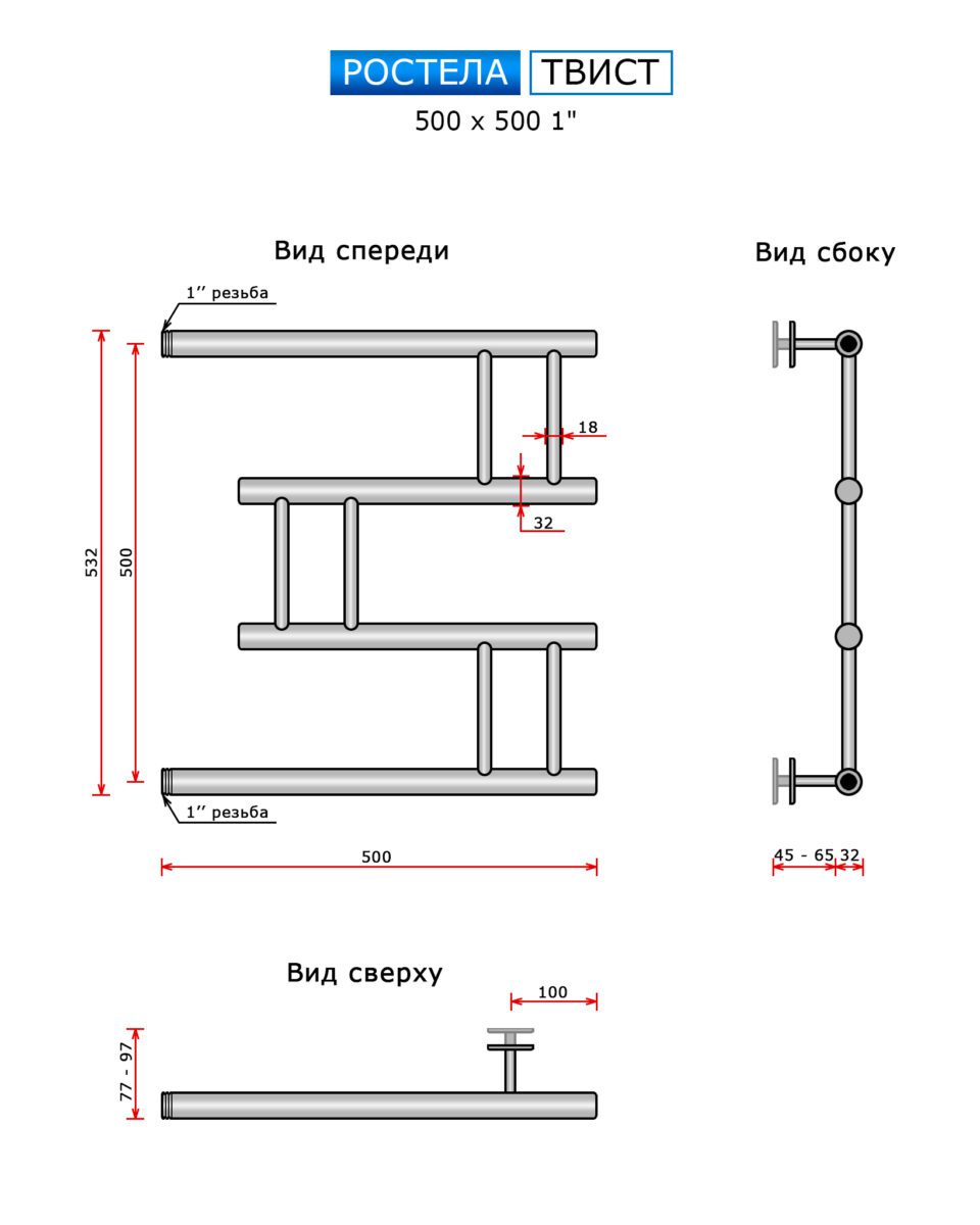 Полотенцесушитель Ростела Ду-25 (бок.подв., 1" резьба) Твист 500 x 500