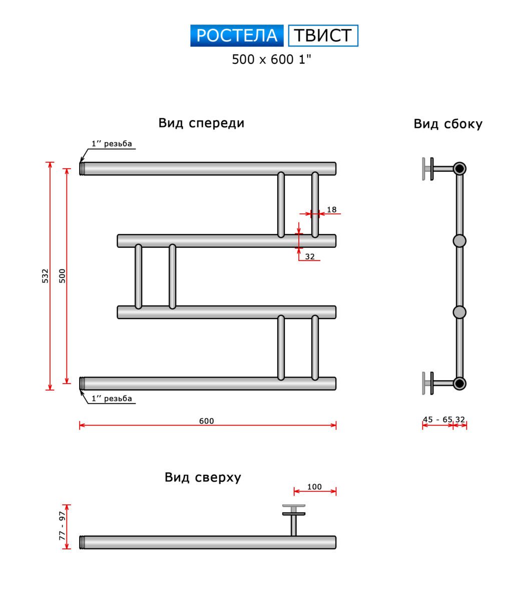 Полотенцесушитель Ростела Ду-25 (бок.подв., 1" резьба) Твист 500 x 600
