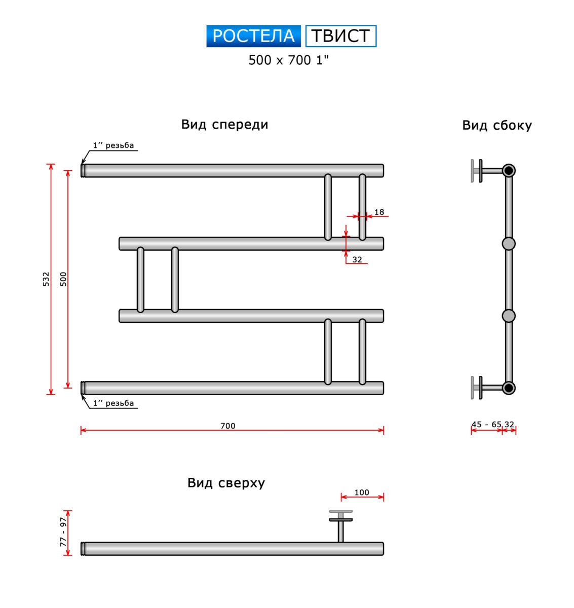 Полотенцесушитель Ростела Ду-25 (бок.подв., 1" резьба) Твист 500 x 700