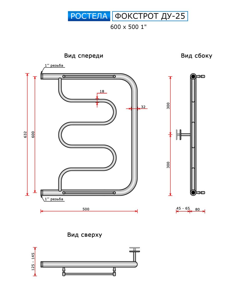 Полотенцесушитель Ростела Ду-25 Фокстрот (бок.подв., 1" резьба) 600 х 500