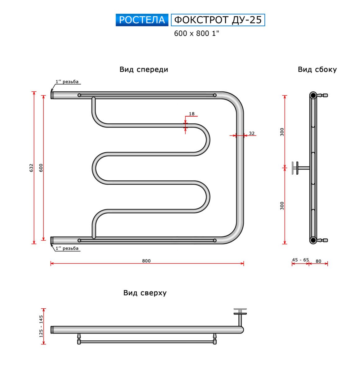 Полотенцесушитель Ростела Ду-25 Фокстрот (бок.подв., 1" резьба) 600 х 800