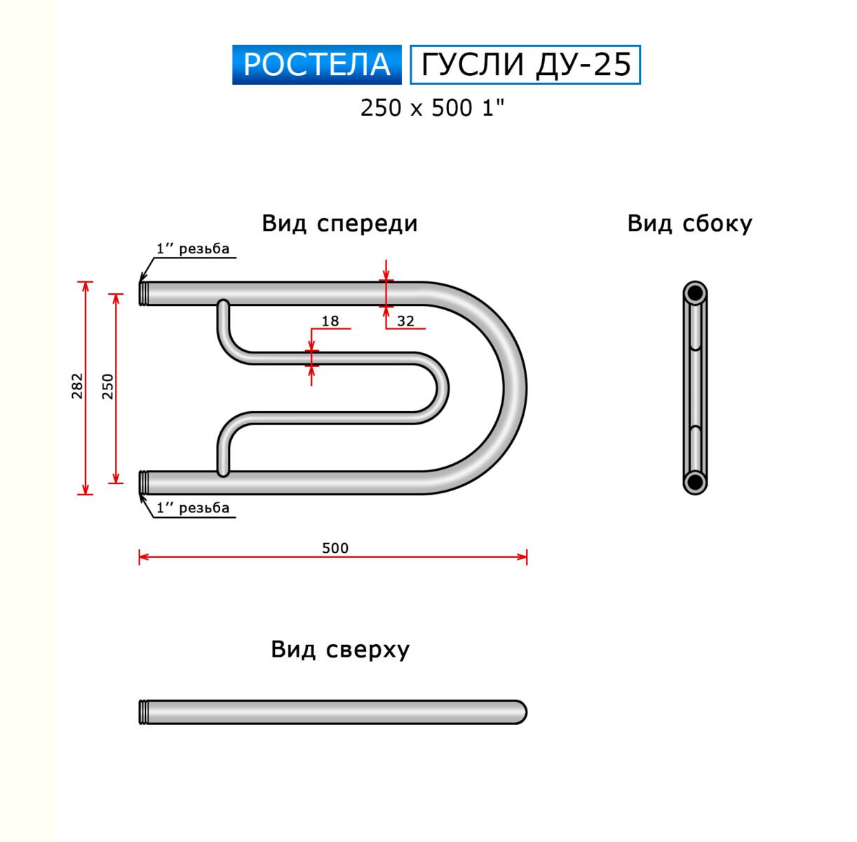 Полотенцесушитель Ростела Ду-25 Гусли (бок.подв., 1" резьба) 250 х 500