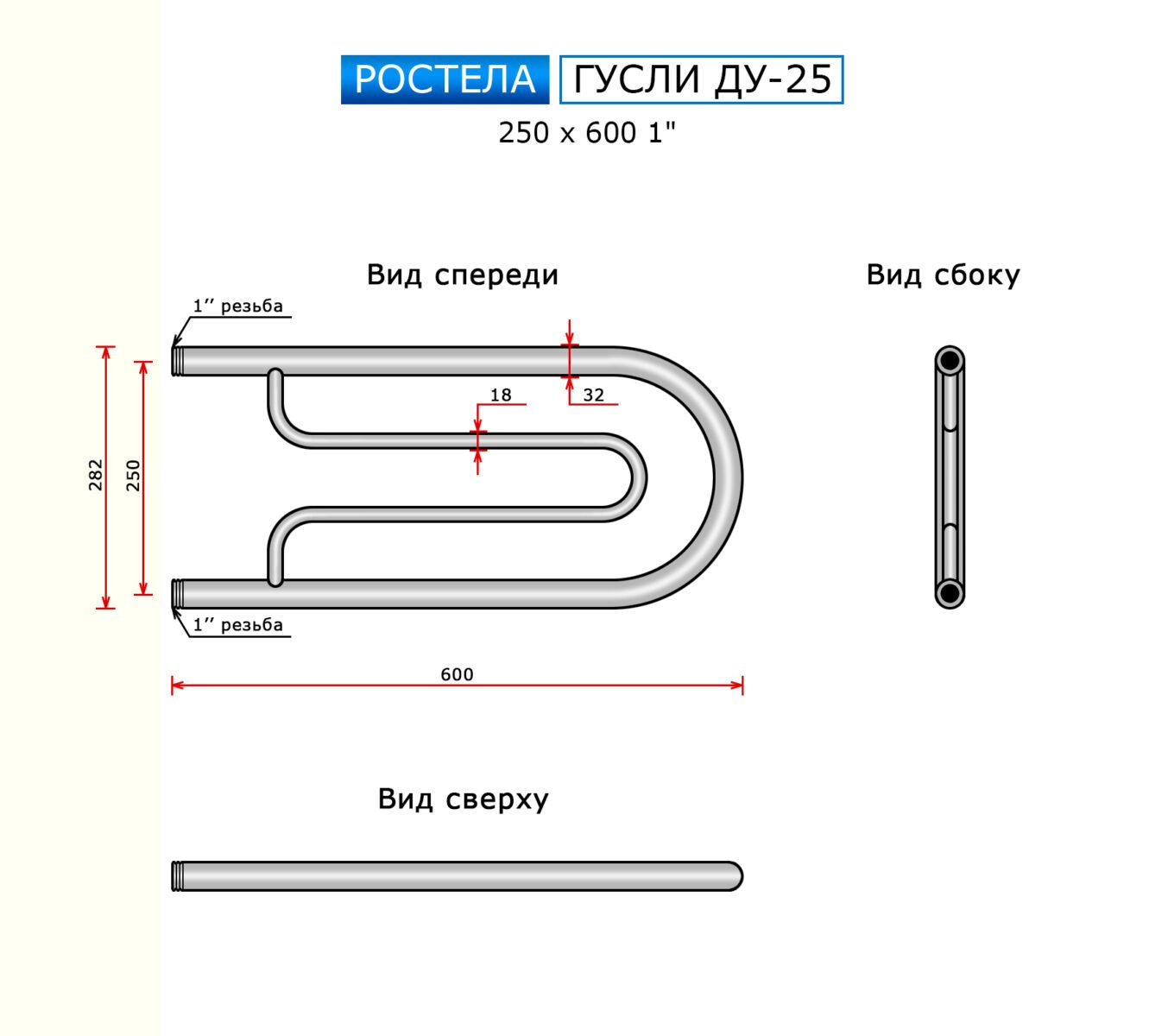Полотенцесушитель Ростела Ду-25 Гусли (бок.подв., 1" резьба) 250 х 600