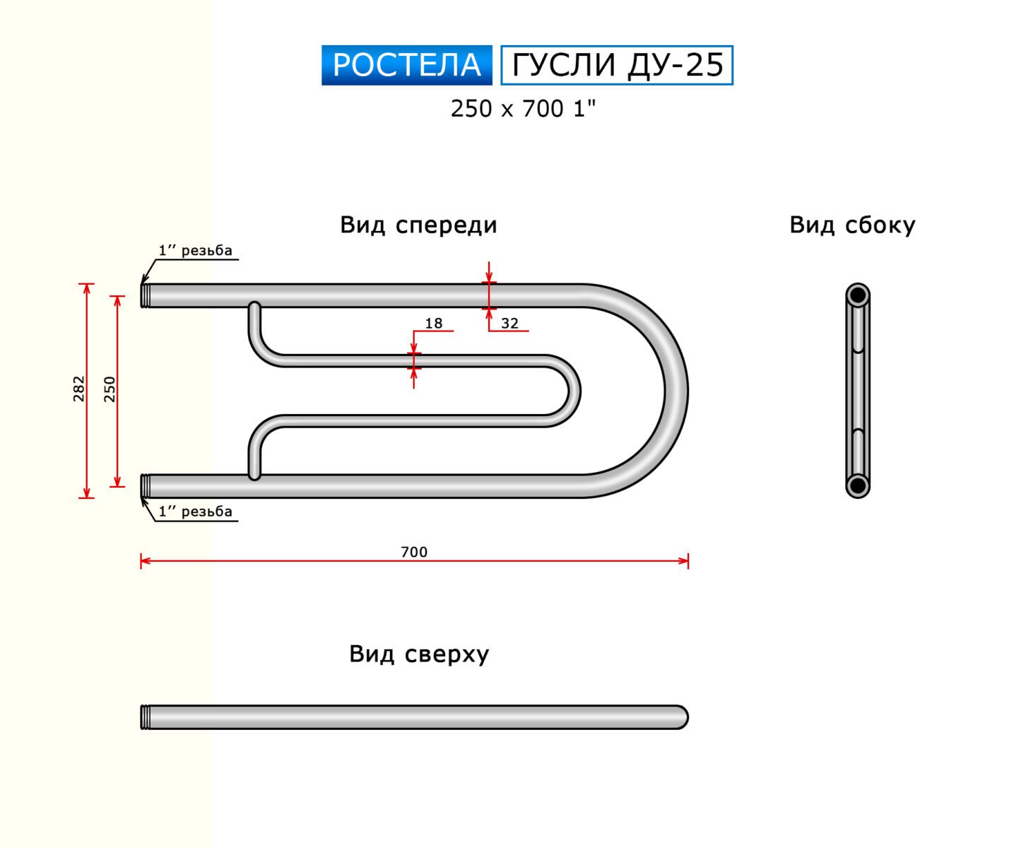 Полотенцесушитель Ростела Ду-25 Гусли (бок.подв., 1" резьба) 250 х 700