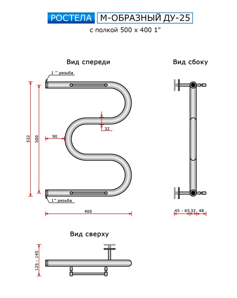 Полотенцесушитель Ростела Ду-25 M-ка с полочкой (бок.подв., 1" резьба) 500 x 400