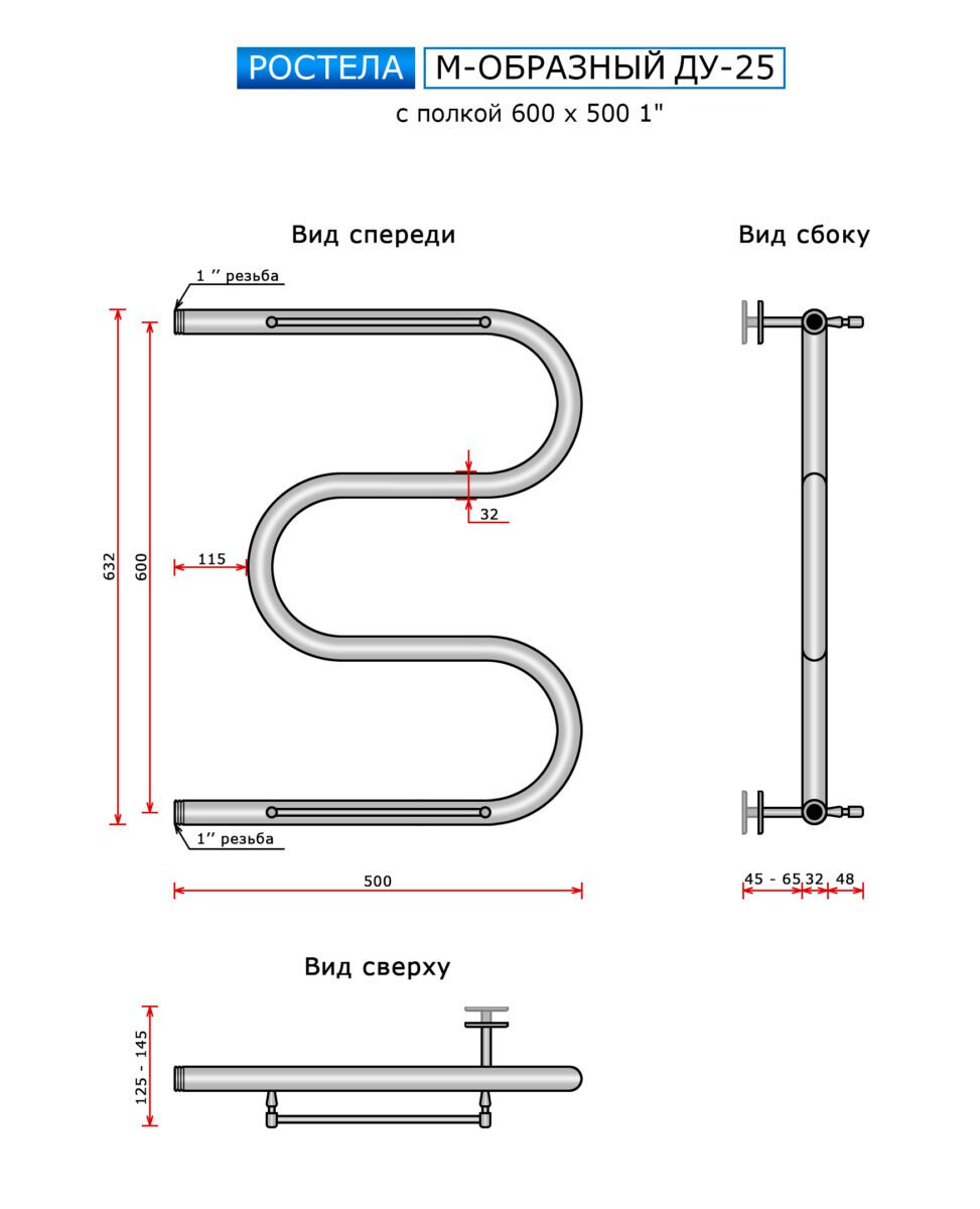 Полотенцесушитель Ростела Ду-25 M-ка с полочкой (бок.подв., 1" резьба) 600 x 500
