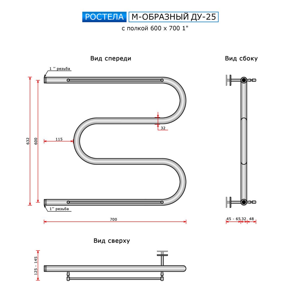 Полотенцесушитель Ростела Ду-25 M-ка с полочкой (бок.подв., 1" резьба) 600 x 700