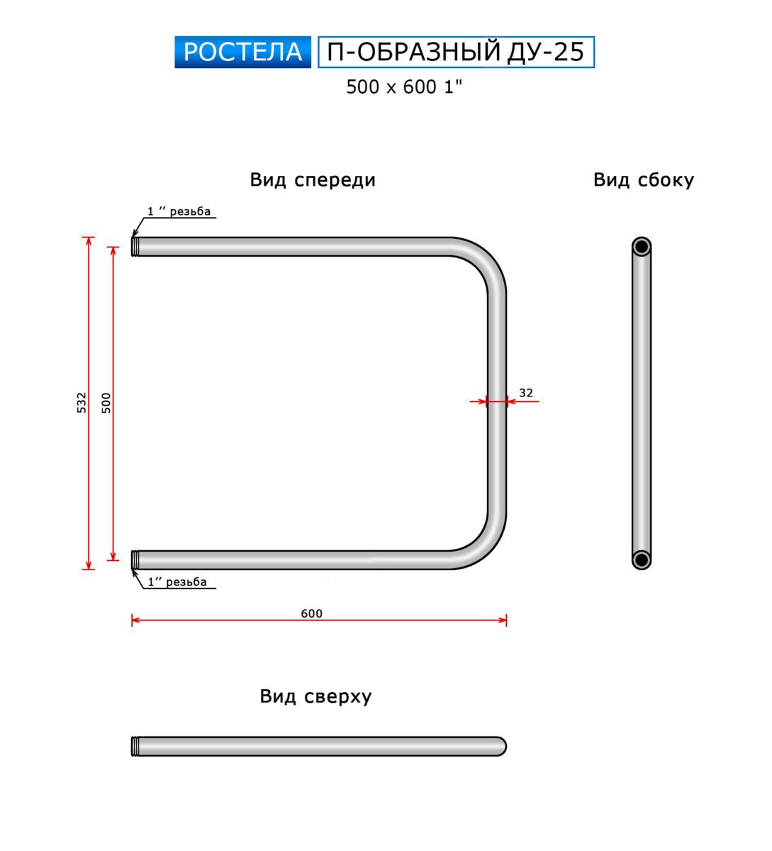 Полотенцесушитель Ростела Ду-25 П-образный (бок.подв., 1" резьба) 500 x 600