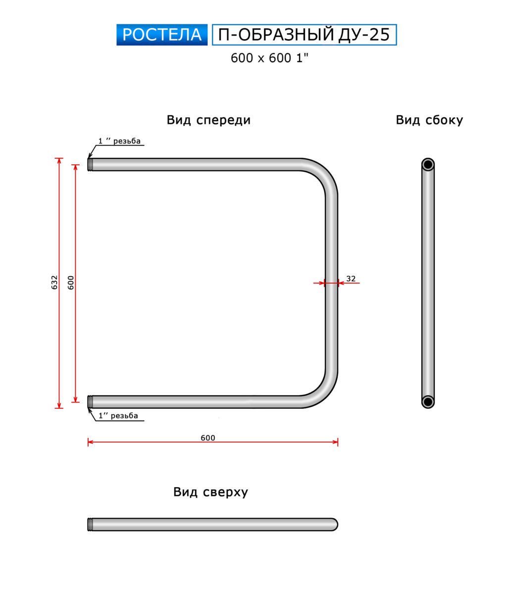 Полотенцесушитель Ростела Ду-25 П-образный (бок.подв., 1" резьба) 600 x 600