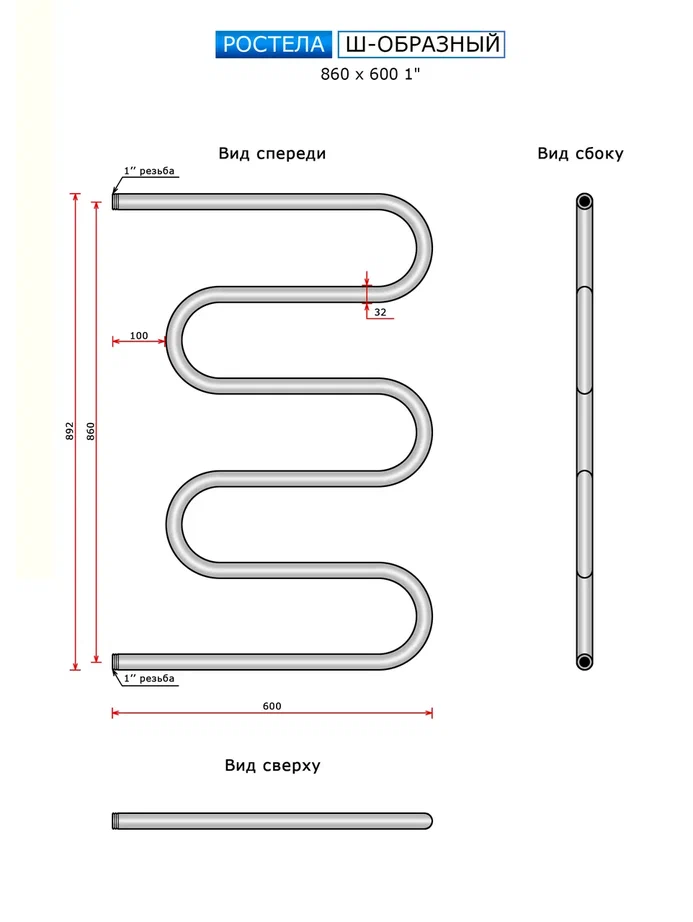 Полотенцесушитель Ростела Ду-25 Ш-образный (бок.подв., 1" резьба) 860 x 600