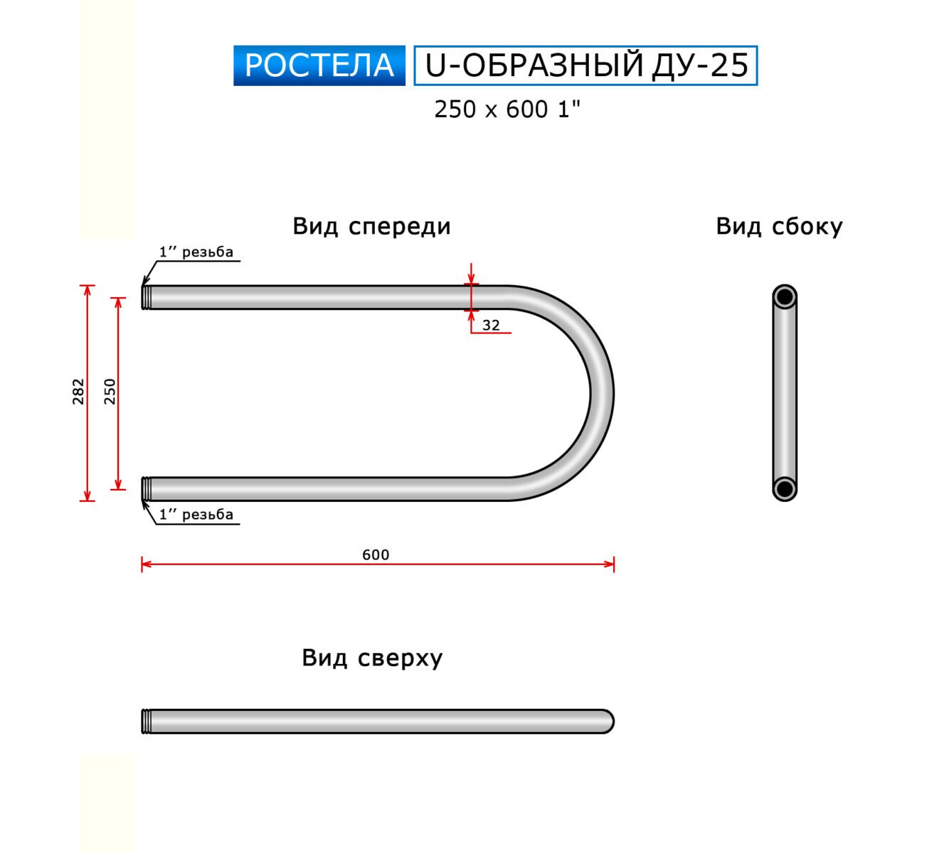 Полотенцесушитель Ростела Ду-25 U-образный (бок.подв., 1" резьба) 250 x 600