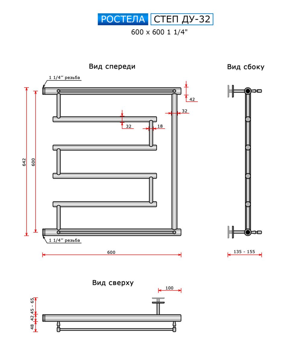 Полотенцесушитель Ростела Ду-32 (бок.подв., 1 1/4" резьба) Степ 600 x 600