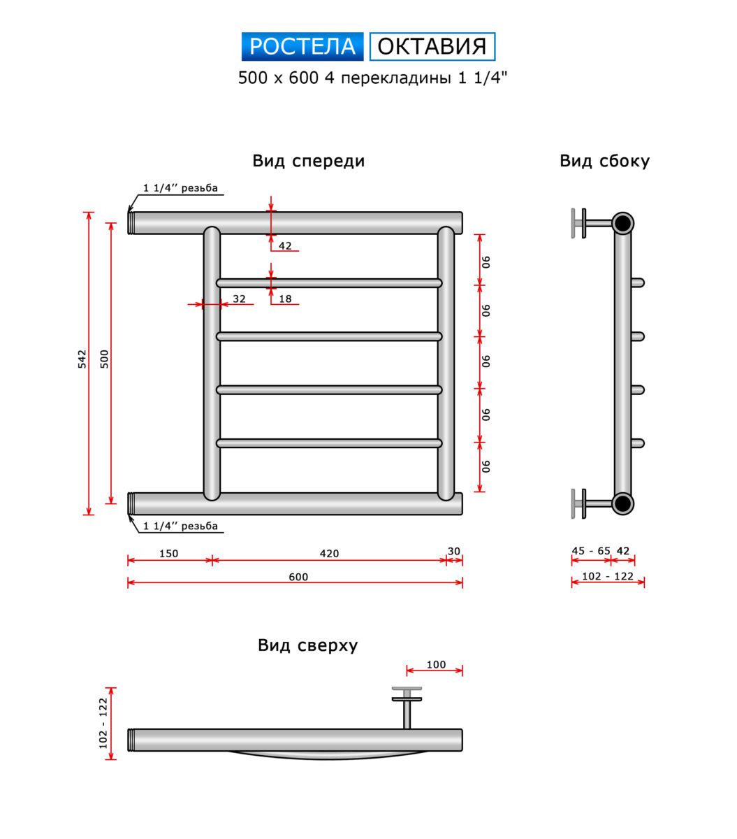 Полотенцесушитель Ростела Ду-32 Октавия (бок.подв., 1 1/4" резьба) 500 x 600 / 4