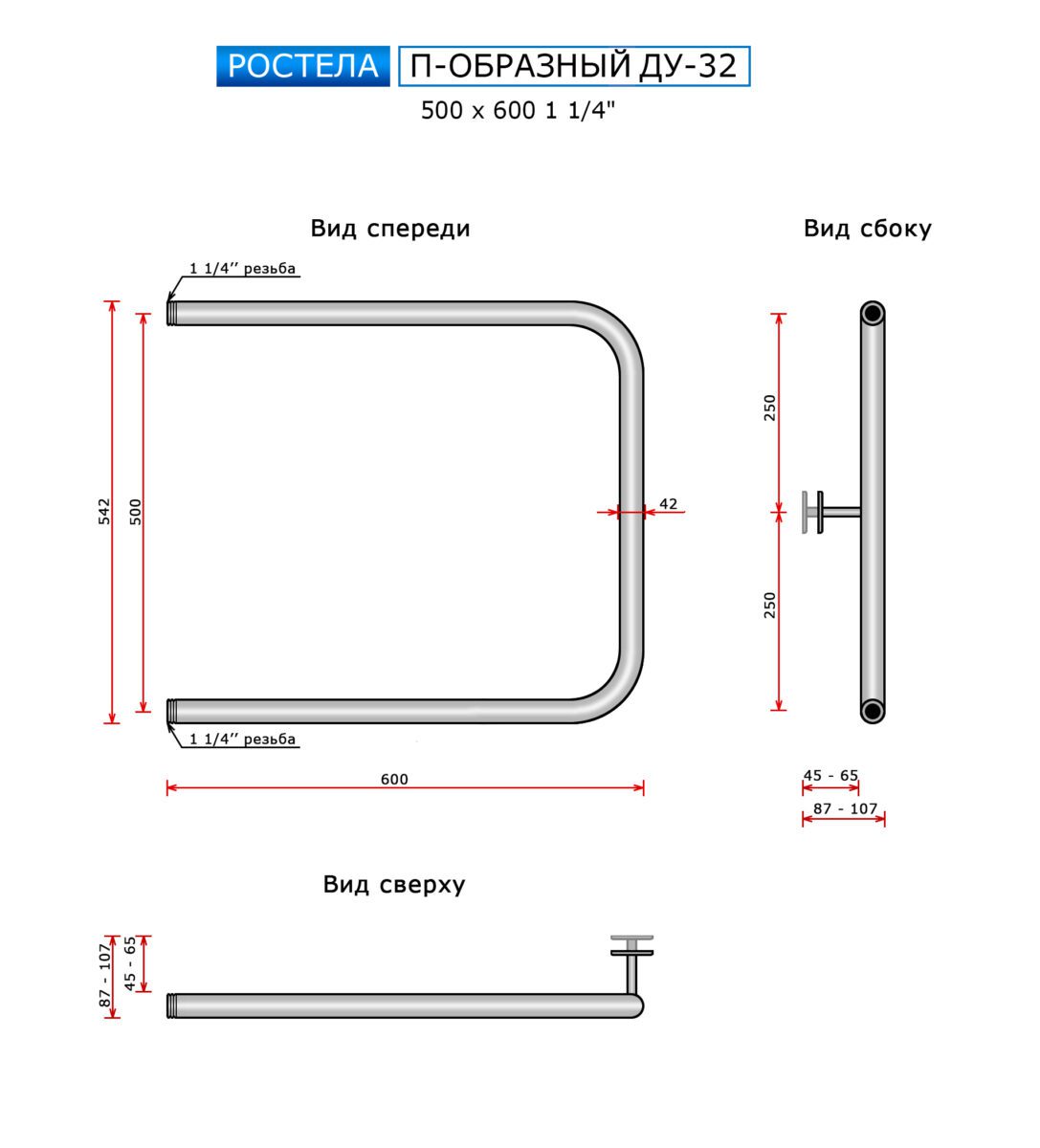 Полотенцесушитель Ростела Ду-32 П-образный (бок.подв., 1 1/4" резьба) 500 x 600