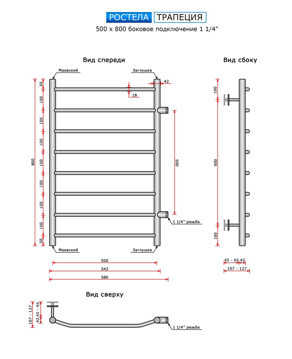 Полотенцесушитель Ростела Ду-32 Трапеция (бок.подв.,1 1/4" резьба) 500х800/8
