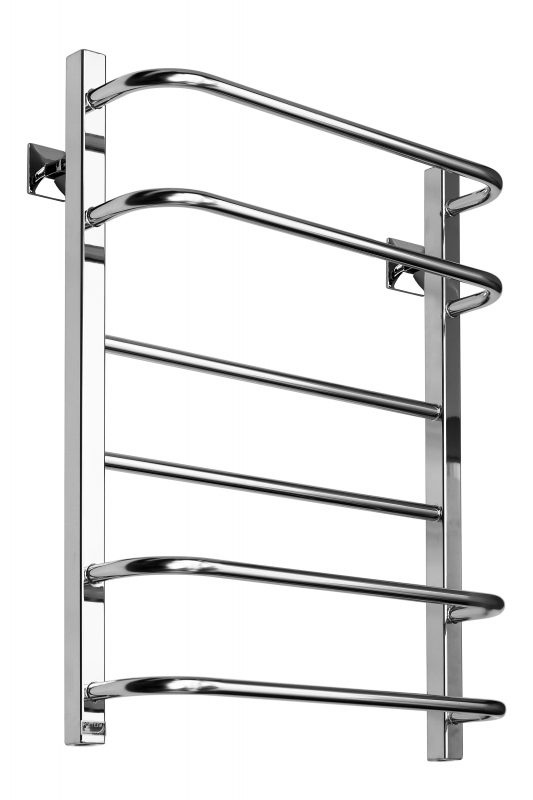 Полотенцесушитель по форме представляет собой лесенку с двумя видами перекладин: прямыми и скобообразными. Прямые перекладины расположены по центру, а скобообразные – две сверху и две снизу. Стойки у полотенцесушителя квадратные.