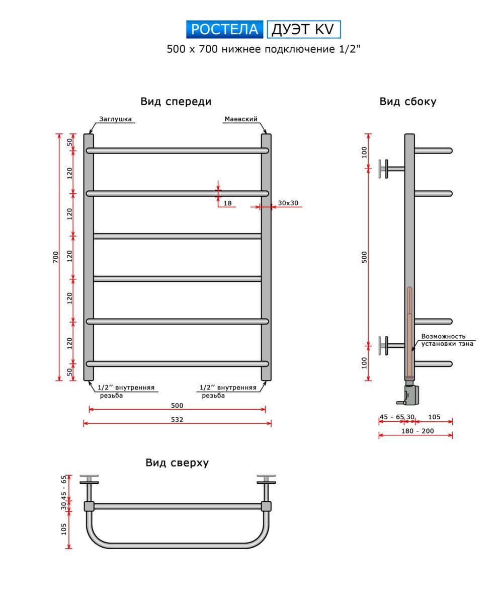 Полотенцесушитель Ростела Дуэт квадрат (нижн.подв., 1/2" резьба) 500 х 700 / 6