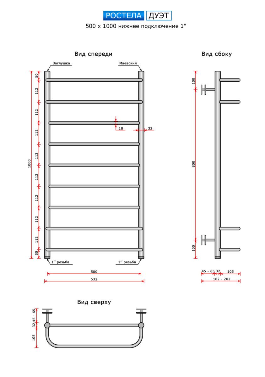 Полотенцесушитель Ростела Дуэт (нижн.подв., 1" резьба) 500 х 1000 / 9