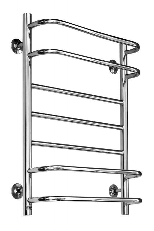 Полотенцесушитель по форме представляет собой лесенку с двумя видами перекладин: прямыми и скобообразными. Прямые перекладины расположены по центру, а скобообразные – две сверху и две снизу.