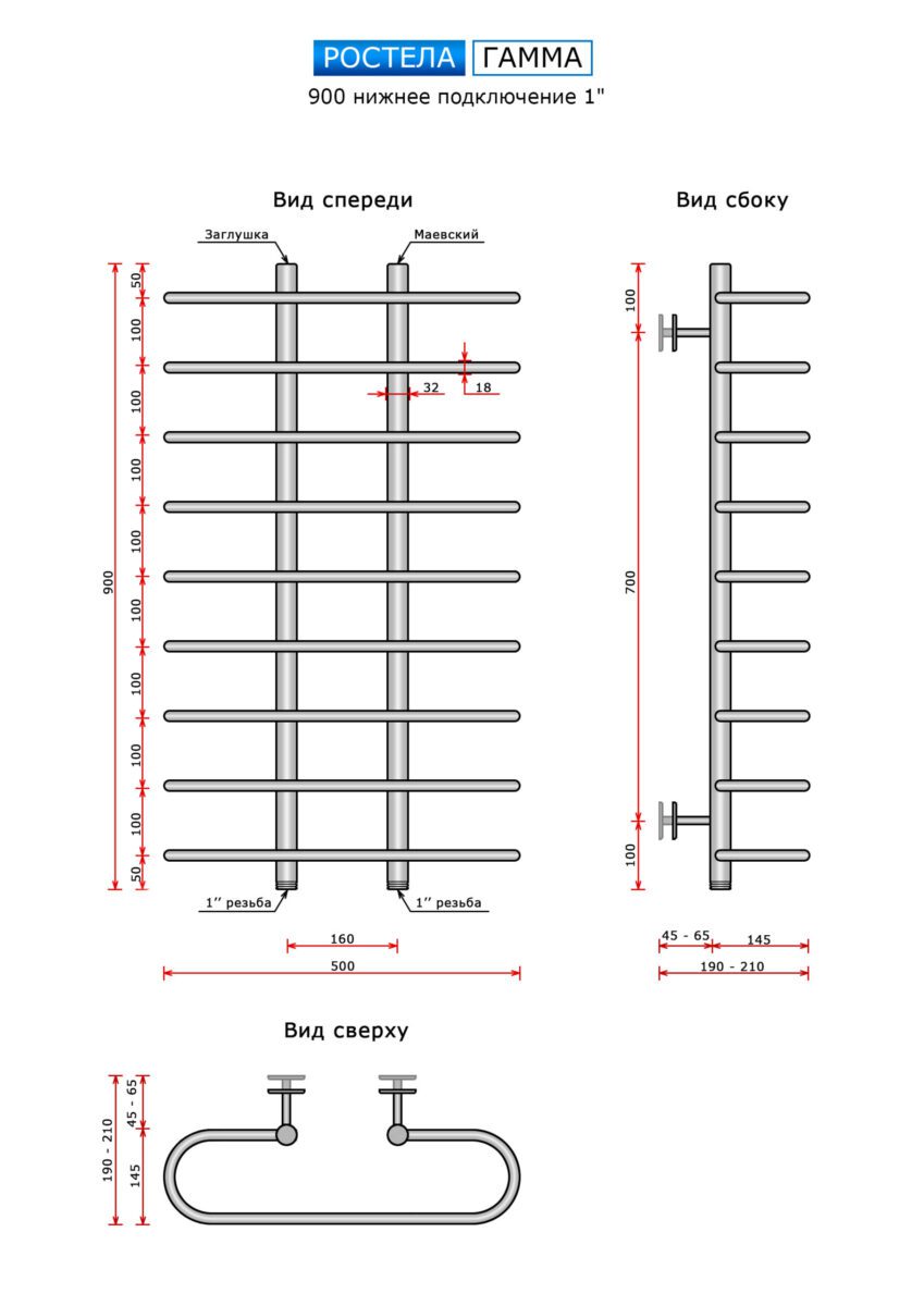 Полотенцесушитель Ростела Гамма (нижн.подв., 1" резьба) 160 x 900 x 500 / 9