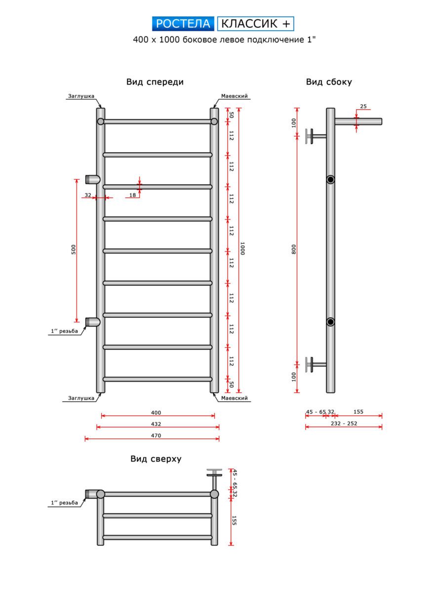Полотенцесушитель Ростела Классик + (бок.подв. левый, 1" резьба) 400 x 1000 / 10