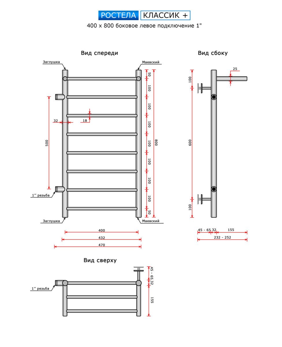 Полотенцесушитель Ростела Классик + (бок.подв. левый, 1" резьба) 400 x 800 / 9