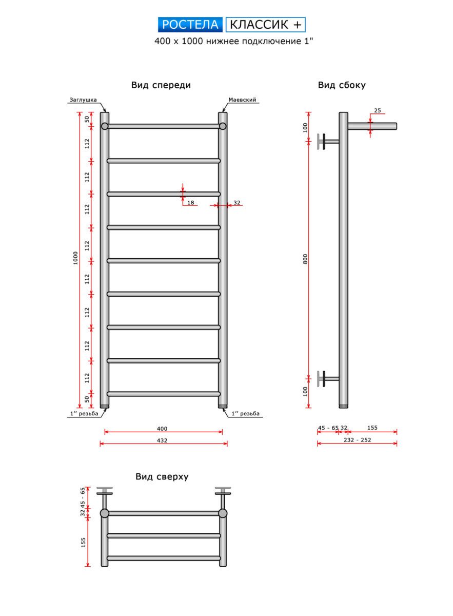 Полотенцесушитель Ростела Классик + (нижн.подв., 1" резьба) 400 x 1000 / 10