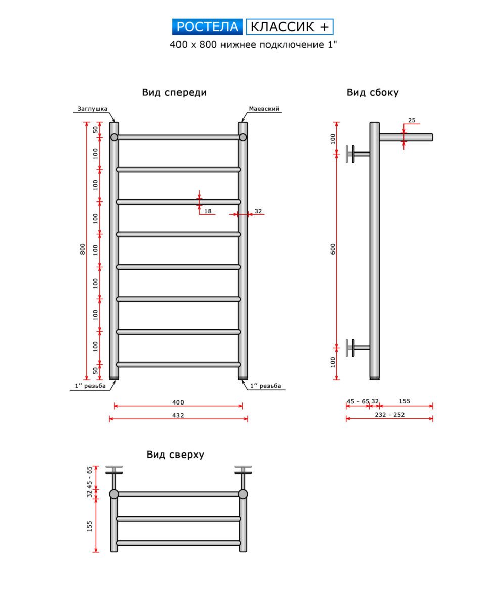 Полотенцесушитель Ростела Классик + (нижн.подв., 1" резьба) 400 x 800 / 9