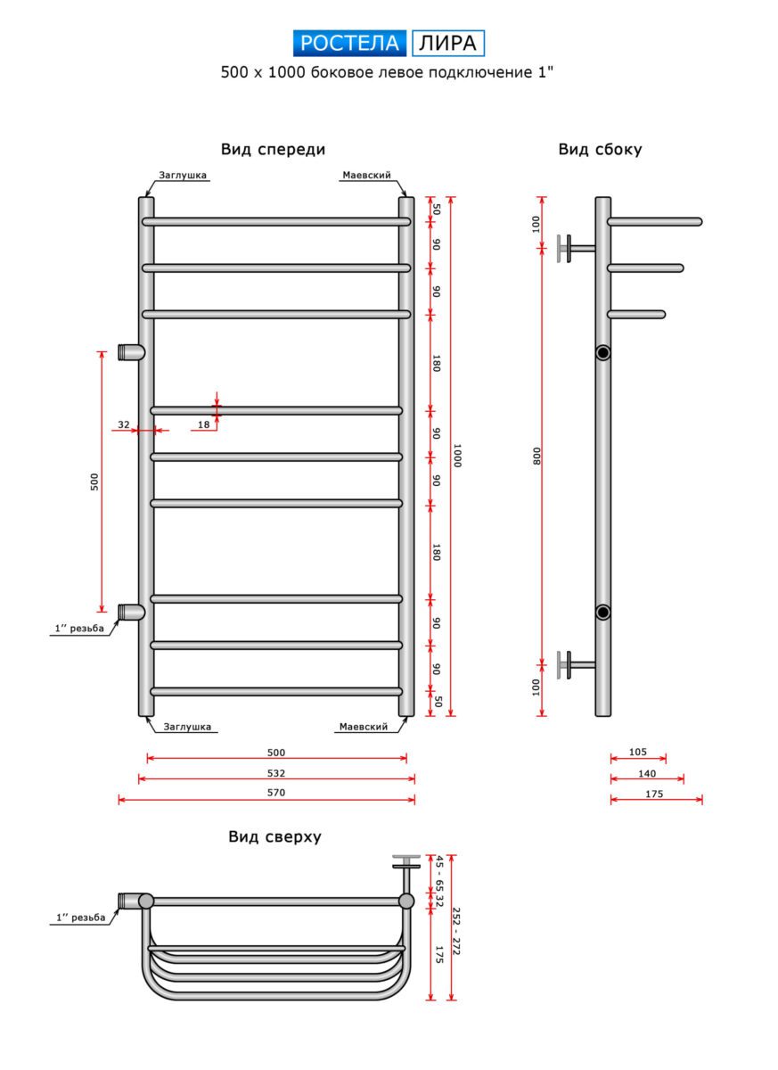 Полотенцесушитель Ростела Лира (бок.подв. левый, 1" резьба) 500 х 1000 / 10