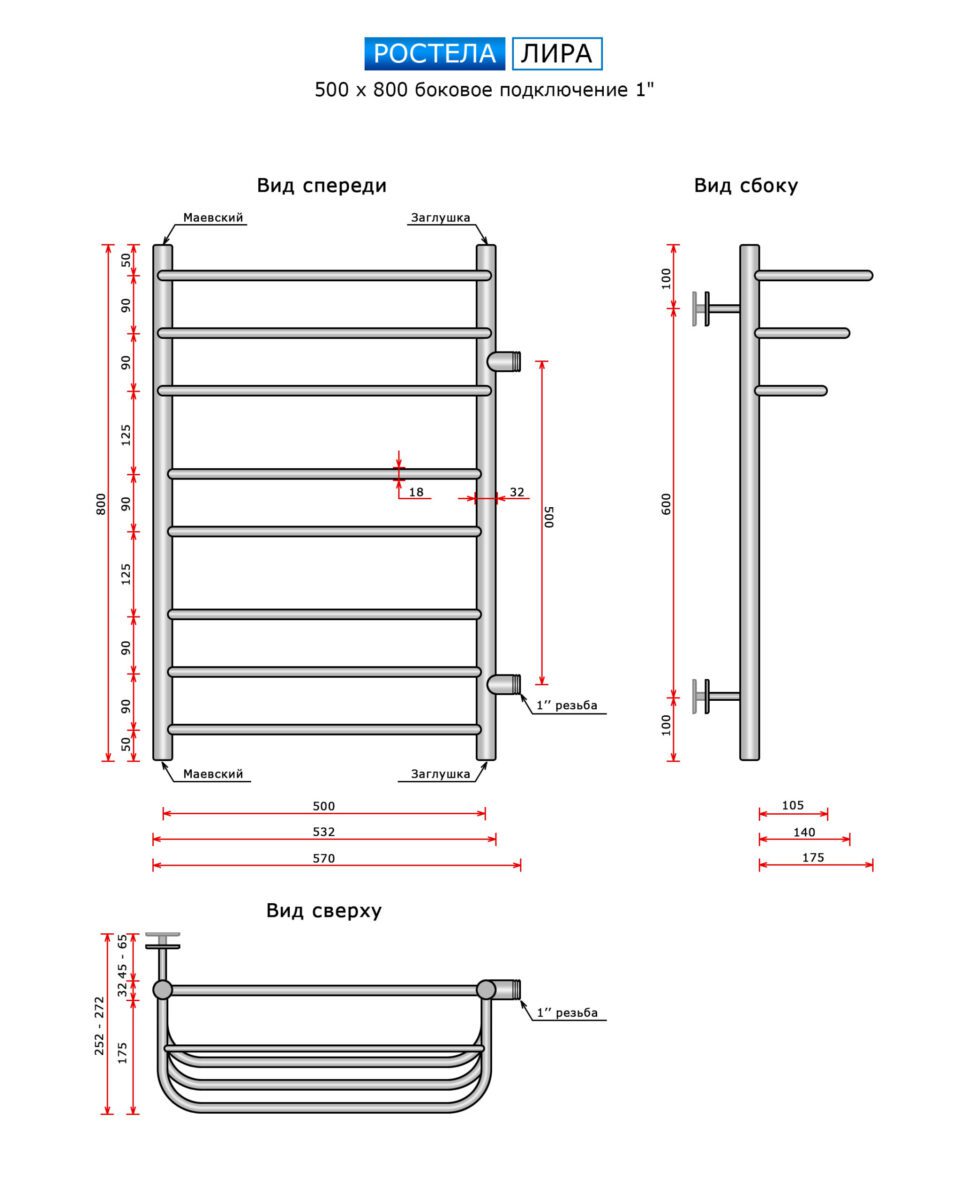 Полотенцесушитель Ростела Лира (бок.подв. правый, 1" резьба) 500 х 800 / 9