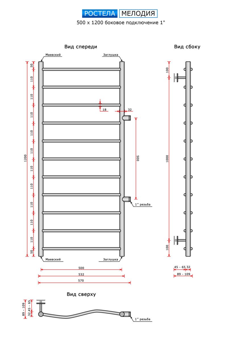 Полотенцесушитель Ростела Мелодия (бок.подв.,1" резьба) 500 х 1200 / 11
