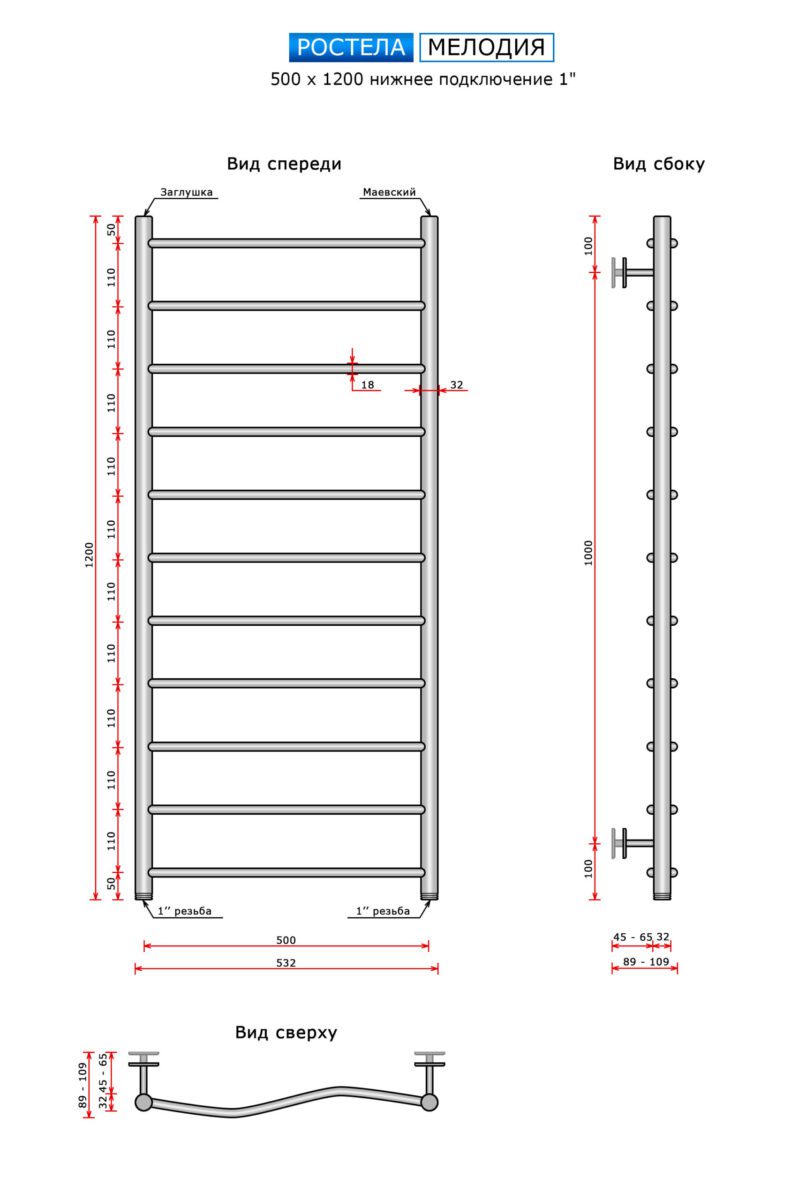 Полотенцесушитель Ростела Мелодия (нижн.подв., 1" резьба) 500 х 1200 / 11