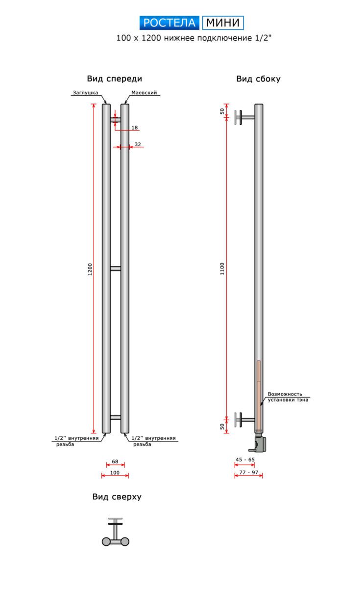 Полотенцесушитель Ростела Мини нижн.подв.1/2" черный 100 х 1200 / 2